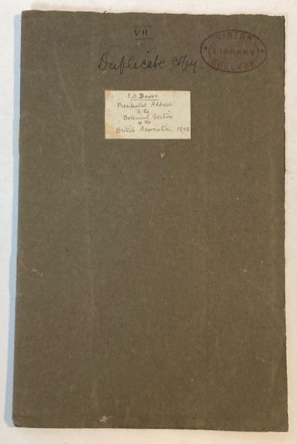 Description: 20p threadbound booklet in earth-brown card covers, light wear to edges, handwritten title label to front cover, faint stamp and words 'duplicate copy' from a Cambridge college, pages a little foxed but otherwise clean and bright like new, very good copy