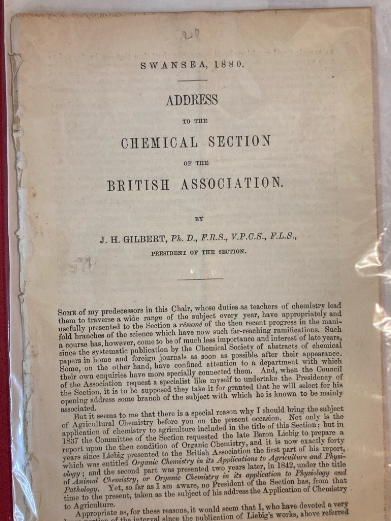 Description: 28p small print, no imprint, removed from binding, "Swansea 1880" to heading, gives a review of agricultural chemistry and its recent advances