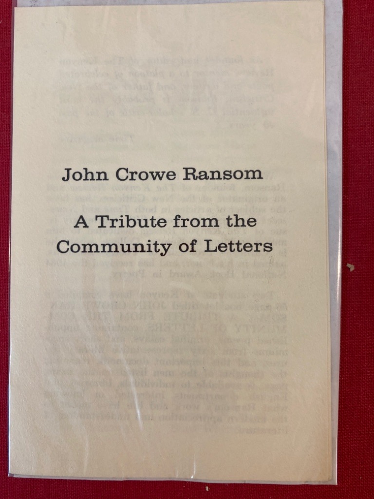 Description: small folded item, advertising A Tribute from the Community of Letters, with order form to back, as inserted in Kenyon Review