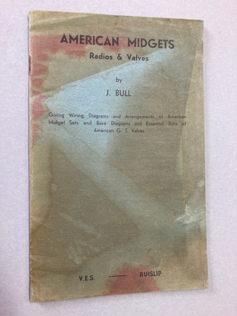 Description: 24p blue booklet, card cover rather stained, stapled binding rusty, a few marks to first pages otherwise very clean, gives wiring diagrams and arrangements of American Midget Sets and Base Diagrams and Essential Data of American G T Valves