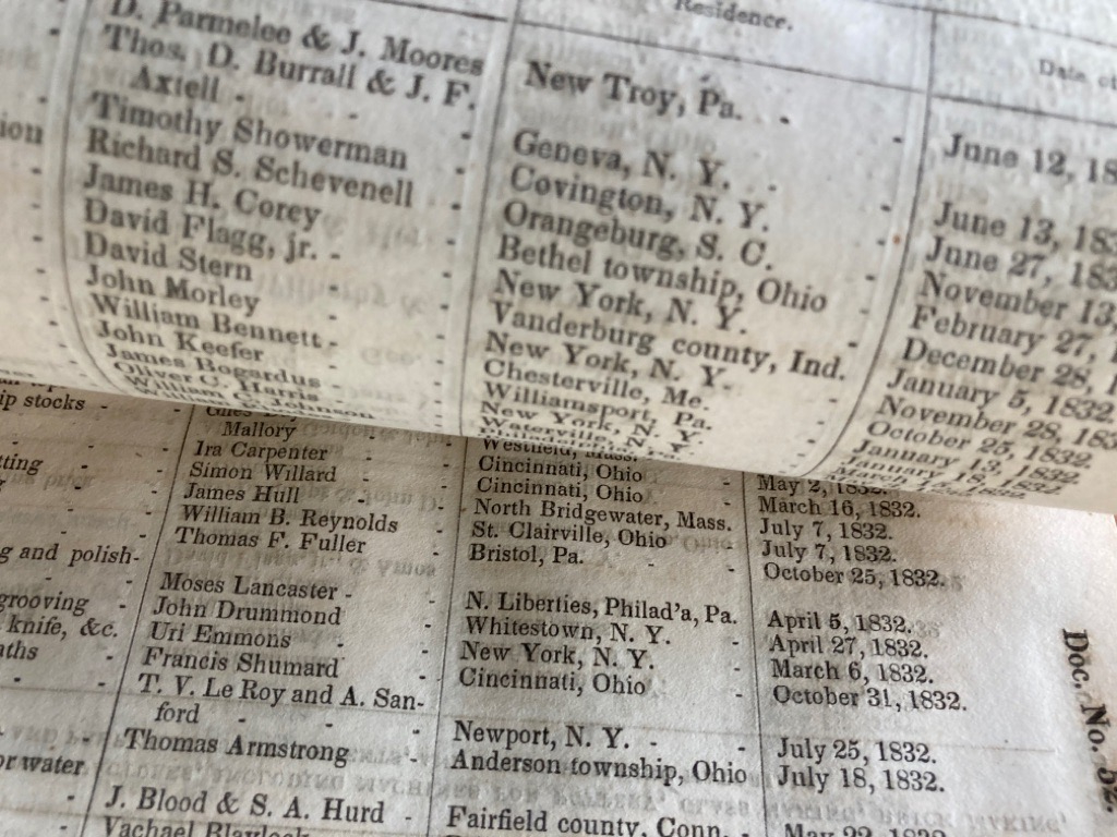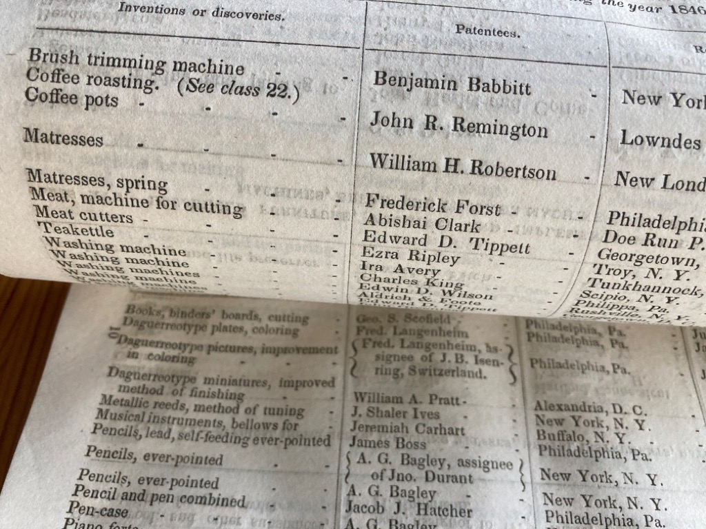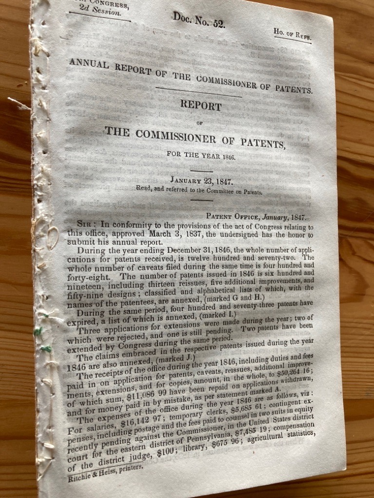 Description: This is the original Document No 52 from US House, 29th Congress, 2nd Session, removed from binding, sewing and spine strong and holding, this item could easily be housed in a new cover. 366p original print, spine firm, contains a discursive account of inventions and patents, followed by various extended tables of patents granted, classified list of patents, list of patentees, patents expired, list of persons whose patents have expired, claims (#4348 - #4913 with reissues and additional improvements), etc. Contains also abstracts on international Patent Law. Burke writes: I am aware that there is a prejudice in the minds of a portion of the community (small I believe it is) against the claims of inventors. It is contended by some that patents securing exclusive rights to the discoverers of new machines or processes of manufacture are monopolies, operating to the detriment of the best interests of the community and existing against the true policy of all just governments; and therefore are to be regarded with suspicion, construed with great strictness, and defeated if possible. (5) Other gems: The United States, at this time, is supposed to have 20,000,000 of inhabitants. It is fair to presume that, upon average, it requires a bed for every three persons. This, then, would give, (say) in round numbers, 7,000,000 beds or mattresses. Much to amuse and challenge the historically interested IP lawyers of the 21st century