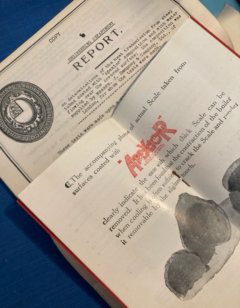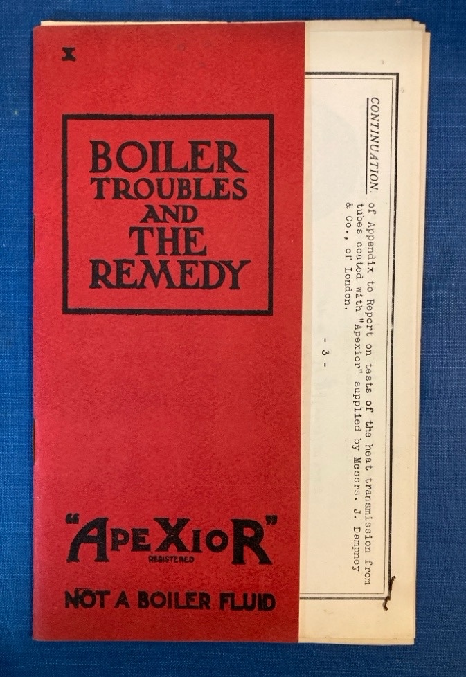 Description: 20p pamphlet, red cover, tall format, with illustrations, included is 10p report on heat transmission of Apexior surfaces, printed on both sides, issued by the National Physical Laboratory, dated 1924, stapled, facsimile of the original, very good