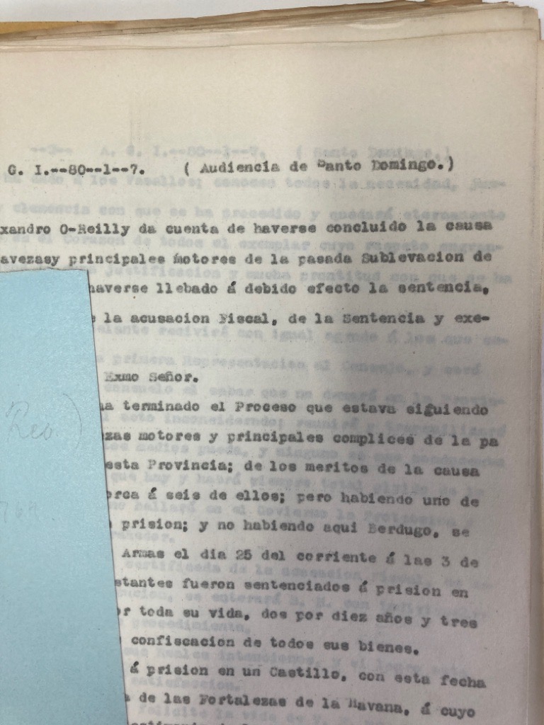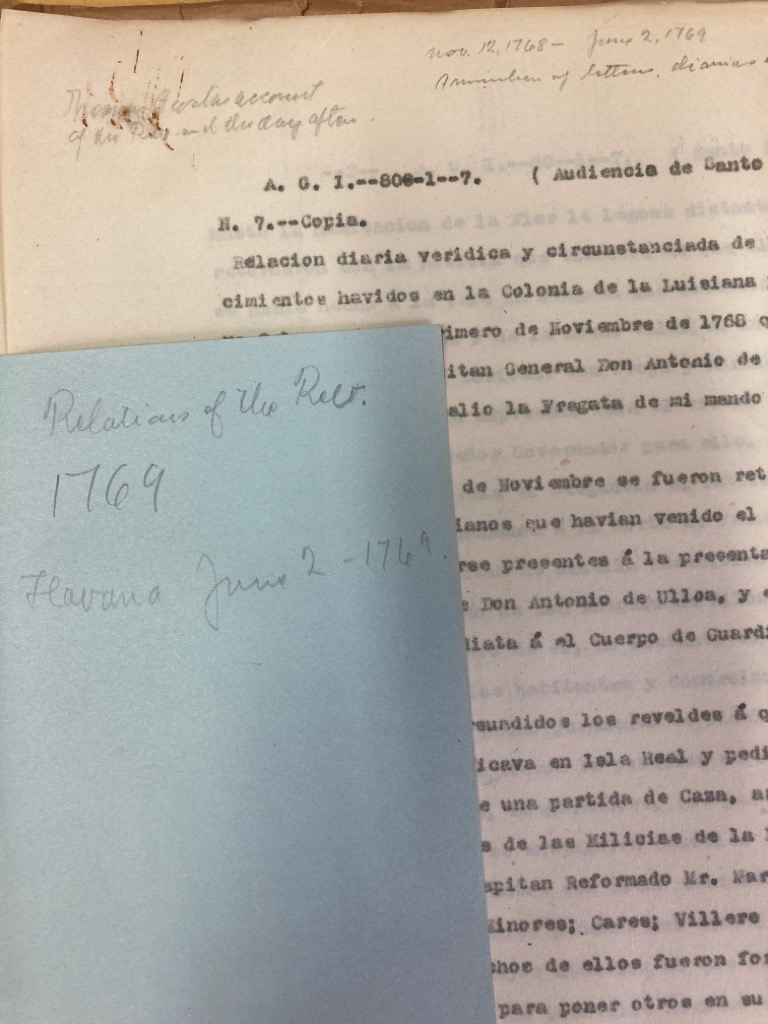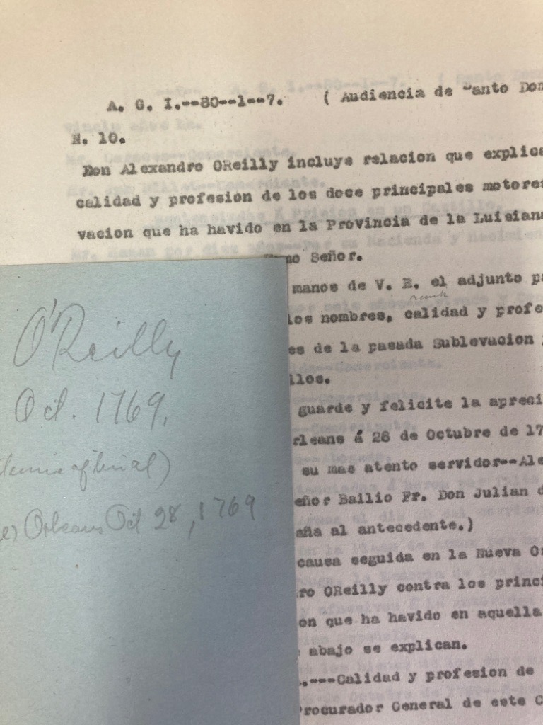 Description: We have here a series of typescripts, approx from 1950, with the name Alexandro O'Reilly and the year 1769 appearing repeatedly in the text. It is not clear how these typescript were produced, and if they were produced with access to the originals. There are some indications that a hired correspondent (B Ribas ?) created these transcripts in a Spanish Archive. The text is in Spanish and related to Cuba if I am not mistaken. The quantity I would estimate 200 pages. They were presumably produced in the pursuit of some academic work. In addition a folder entitled "New Documents from Ribas" which transcribes 86-6-7, 80-1-6 comprising approx 80 pages of typescript, also hand-drawn copy of tables, also a folder "Royal Cedulas of Appointments in Louisiana" 84p typescript reproducing 86-5-21 in its entirety it seems. The fact that David K Bjork published on "Alexander O'Reilly and the Spanish occupation of Louisiana, 1769 - 1770" in the 1930ies leads us to list this material under his name. Housed in a modern red file folder box