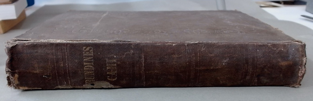 Description: xiv 261p worn and aged cloth binding with floral frame blindstamped, spine in place but hinges opening, edges very rubbed, text printed in a red frame throughout, with woodcut decorations, some browning to a few pages, Latin and English poetry on facing pages, poor exterior appearance, but text mostly still nice