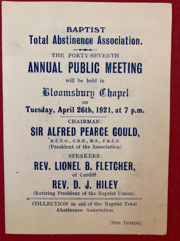 Description: 4p folded card 12cm, includes notes on the chairman Sir Alfred Pearce Gould and the speakers Lionel B Fletcher and D J Hiley, very well preserved, very good