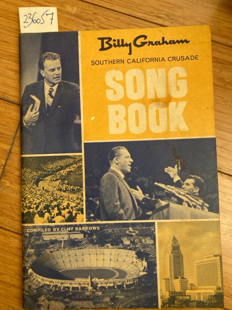Description: 74p stapled booklet, orange cover with illustrations, with Crusade Associates Portraits, musical notation, many songs
