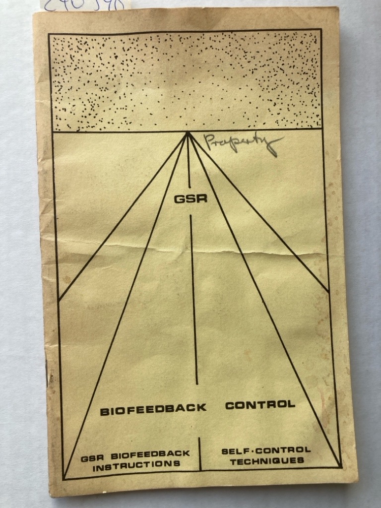 Description: 22p booklet, yellow card cover, text reproduced from typescript, this copy is worn and shows signs of exposure to humidity, pencil not "Property" to cover, text intact and readable, a rare item, but not a beauty: Galvanic Skin Resistance in action