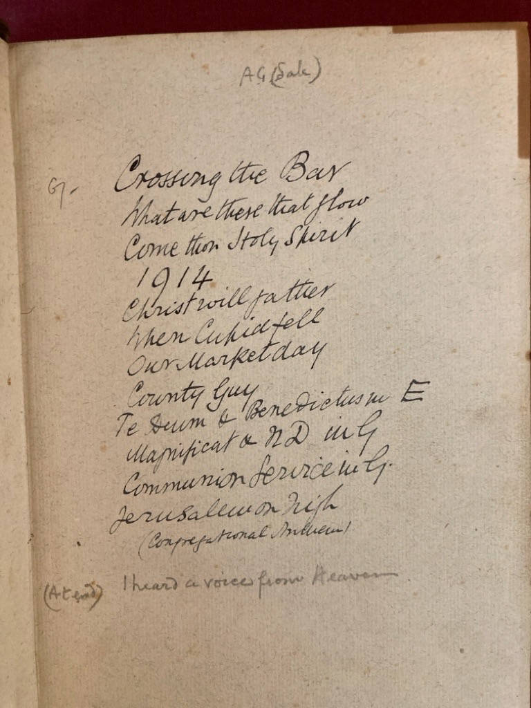 Description: half calf hardback, spine detaching but binding holding well, collection of pieces, pencil note to endpaper "AG Sale" indicating that this collection was produced for the composer, table of contents in ink in the hand of AG (?), includes Crossing the Bar, What are those that Glow, Come then Holy Spirit, 1914 (Rupert Brooke), Christ will Gather, When Cupid Fell, Our Market Day, County Guy, Te Deum, Benedictus, Magnificat, Communion Service in G, Jerusalem on High, I heard a Voice from Heaven, on spine "AG 5", unique collection