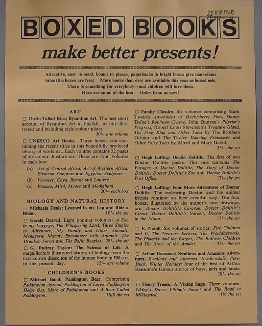 Description: single sheet, folded, on yellow card, advertising boxed books: Attractive, easy to send, bound to please, paperbacks in bright boxes give marvelous value (the boxes are free!)