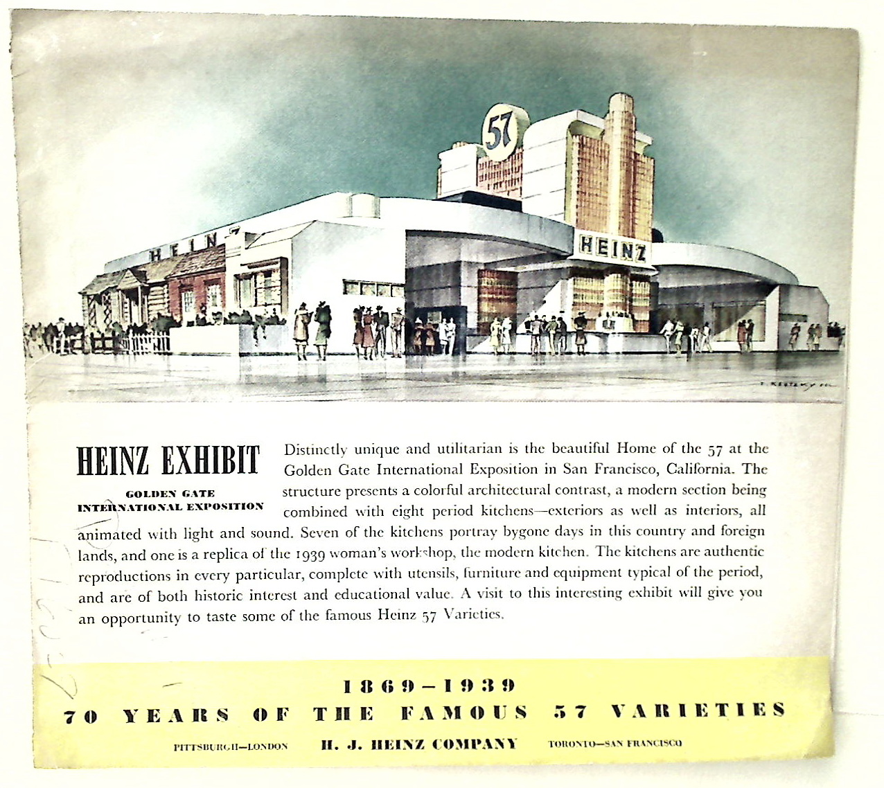 Description: single sheet, colour printed folded folded twice (3x), with architectural views, traditional and modern cooking, 57 varieties depicted, some old pencil notes to exterior, some creasing and light soiling, original