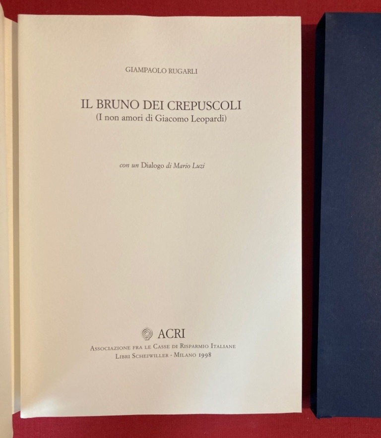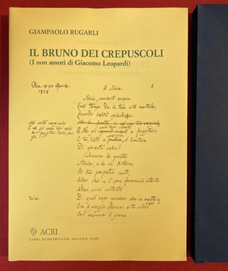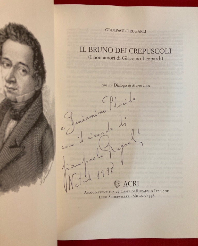 Description: 225p large format white paperback with cream yellow illustrated dustjacket, navy blue slipcase present, with frontispiece of Giacomo Leopardi, pages and plates clean and bright, inscription to title page by author ("a Beniamino Placido con il ricordo di Gianpaolo Rugarli Natale 1998"), excellent copy, excellent condition, like new (ISBN: 9788876442605)