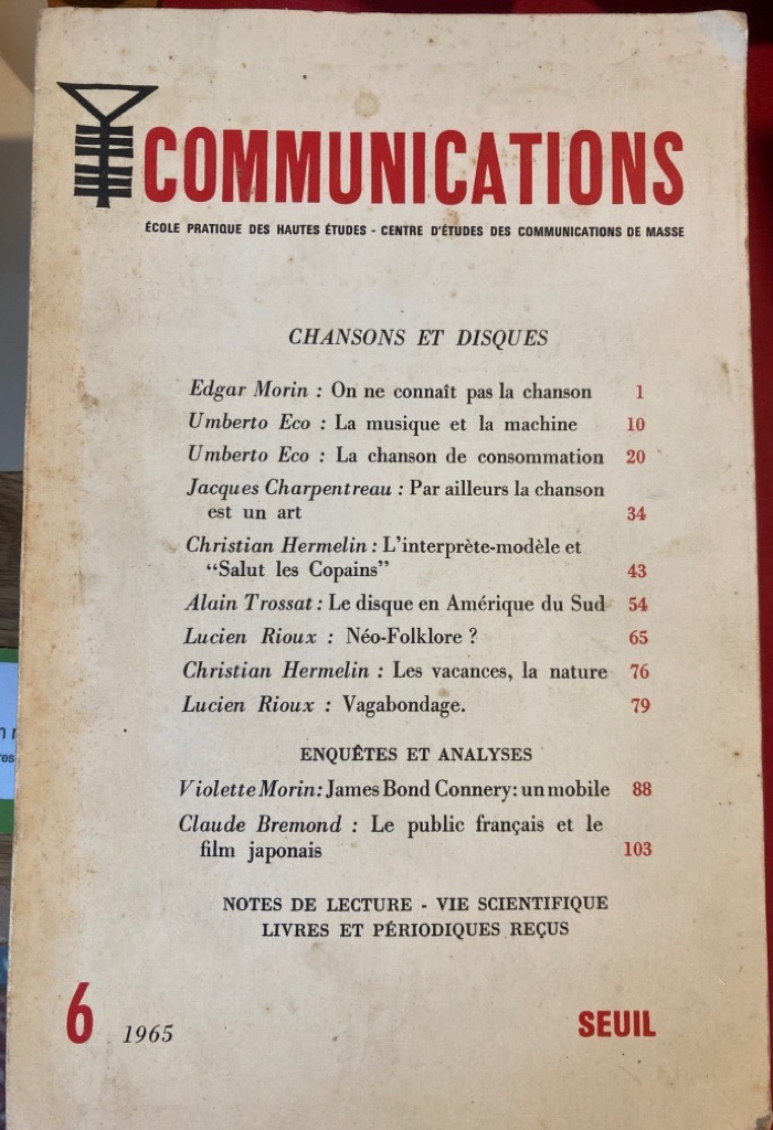 Description: 160p large paperback, white card cover with red lettering, pages unmarked, binding firm, very good, special issue of this journal, includes essays by Morin, Eco (2x), Charpentreau, Hermelin, Trossat, Rioux, etc