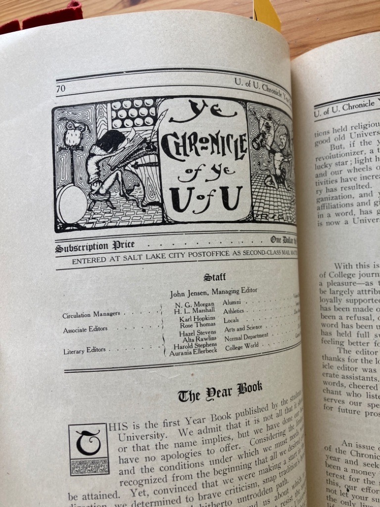Description: 120(?)p paperback, bright red card cover with white lettering, edges a little worn but text clean and still tight, many plates, illustrations and adverts, first installment of this yearbook (p70), hand-drawn caricature inserted, uncommon college yearbook