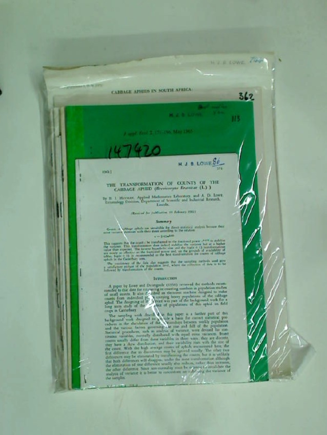 Description: together 19 offprints, weight approx 600 gramms, includes papers on Olefactory Reactions, Population Dynamics, Over-Wintering, Starvation and Crowding, Amino Acids, Counts, Mortality, Uncultivated Land, in South Africa, New Zealand, many with name stamp of H J B Lowe, some with notes or authorial greetings