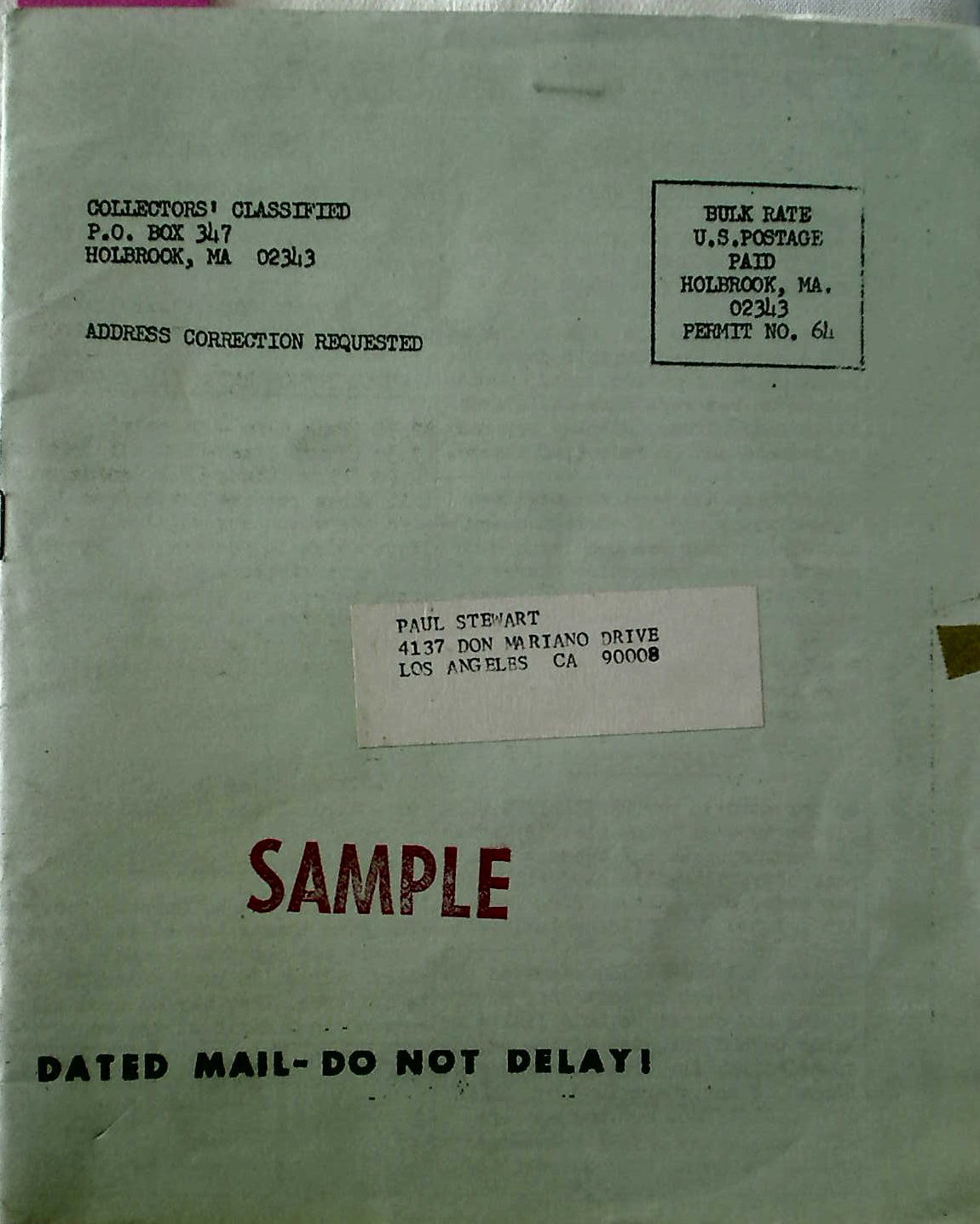 Description: 28p folded and stapled, blue paper cover, partly from typescript, advertising for collectors, contributions by Winston Harris and Greg Tuliebitz, the collector's market 1978