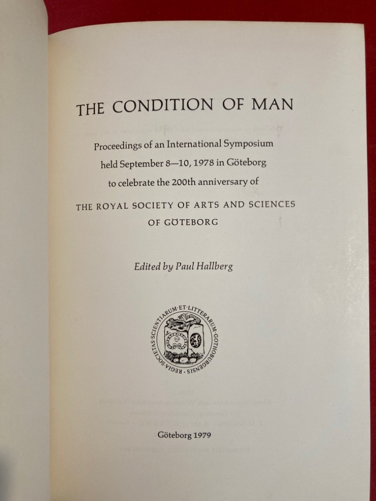 Description: 228p blue hardback cloth, fresh copy, paper by Moberg (Mankind remembers) with a few red ink annotations, with inscription by Moberg, else a clean copy