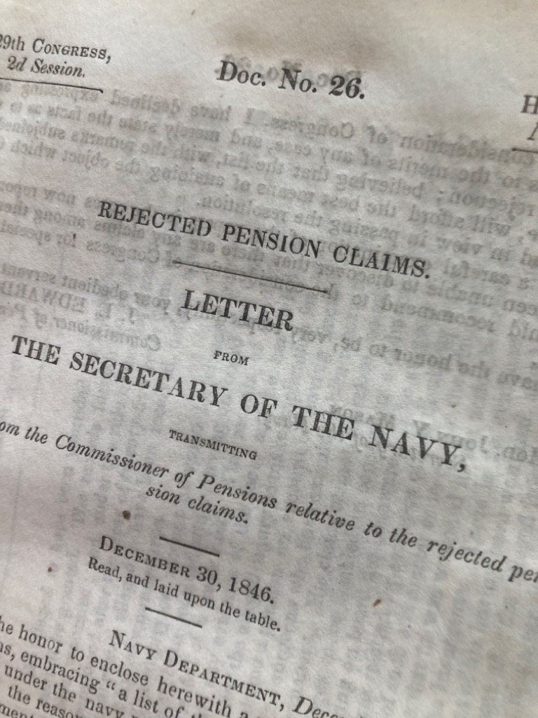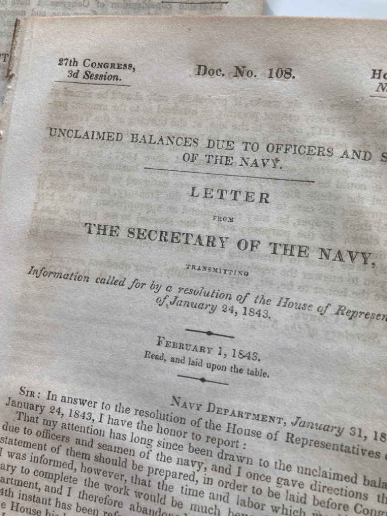 Description: A collection of shorter navy related documents, mostly from 29th Congress, 2nd Session, a few pages each, some a single page only, removed from binding, original print, disbound navy history from government documents