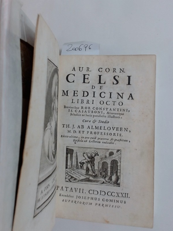 Description: lxxii 598p plus (16p) index, portrait frontispiece, title page with archaeological vingnette "Quidquid sub terra est in apricum proferet aetas", bound with Q Sereni Samonici: De Medicina Praecepta Saluberrima, 115p with large publisher's arms to last page, with publisher's two page advert at end, printed with ornaments and initials throughout, nice white paper, some soiling to second title page, some sections with faint pencil notes to margin, still a well preserved volume, bound in full calf, sewing tight, spine detaching, corners rubbed, equipped with a custom dustjacket made from old vellum, lettered De Medicina Libri Octo to spine