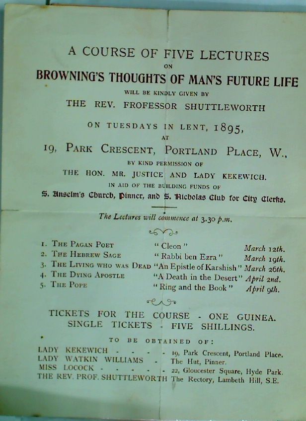 Description: Single sheet, folded twice, announcement of the lecture course offered at 19 Park Crescent, Portland Place, giving details of topic, and how to obtain tickets. The speaker finds himself misspelled Frofressor Shuttleworth, the event is sponsored by Lady Kekewich
