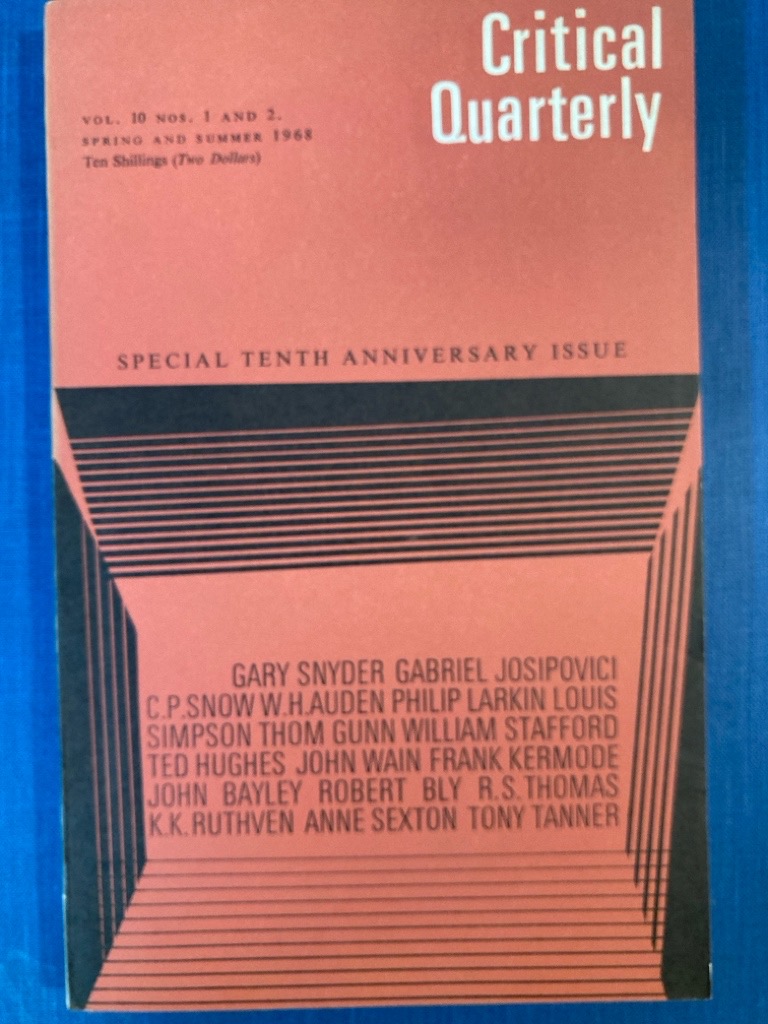 Description: 200p special issue, contains poetry by R S Thomas, P Larkin, T Gunn, J Stallworthy, Ted Hughes, Anne Sexton, etc, Essays by Kermode, Ruthven, D Davie etc