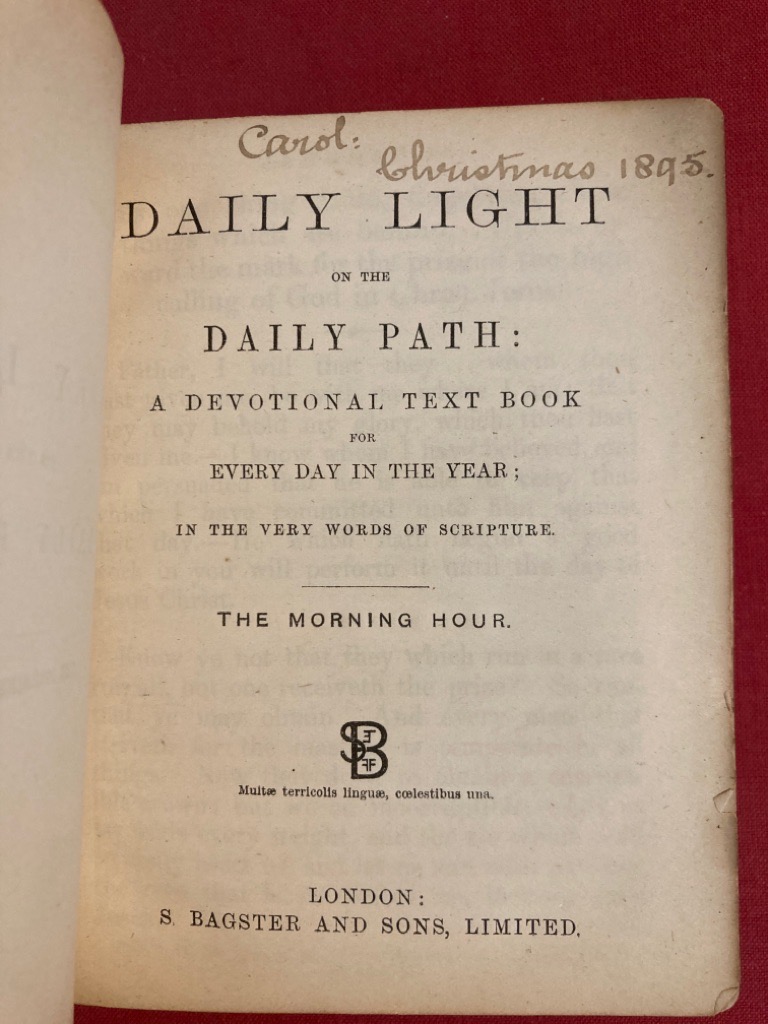 Description: a stout little volume (10 x 13 cm), not paginated, black full leather, all edges gilt, well preserved, some items inserted, gift inscription dated Christmas 1895, very good