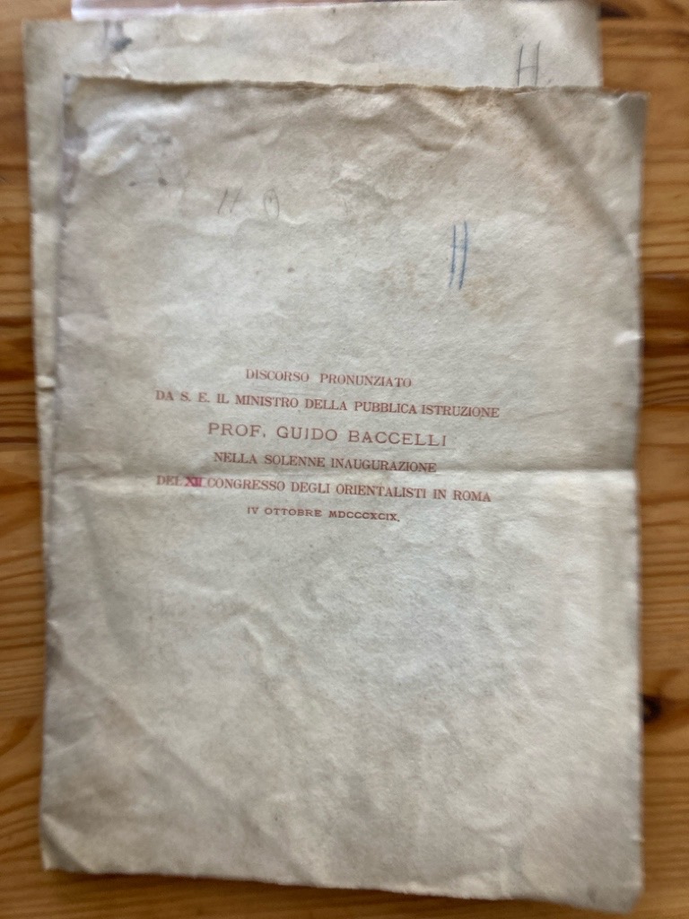 Description: This is a single sheet, folded, title in red ink to front, the address itself is in Latin, single correction in ink (tertium / alterum), together with a second similar item, (Discorso Pronunziato ... nel Giorno in cui i Romeni Deponevano una Corona di Bronzo ai Piedi della Colonna Trajana, 10 Ott 1899) the text of this address is in Roumenian, both items are dusty, soiled, with discolouration and creases, unique items
