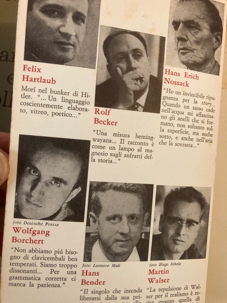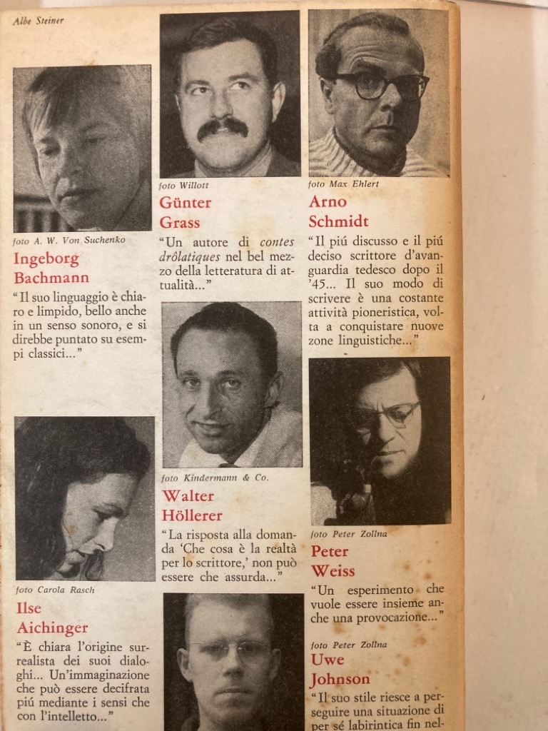 Description: 343p large paperback, light browning to cover, cover folding displaying portraits of 19 German authors, a clean copy, no names or stamps, authors include Wolfdietrich Schnurre, Arno Schmidt, Grass, Ingeborg Bachmann, Peter Weiss, Uwe Johnson, Ilse Aichinger, Walser, Hartlaub, etc, designated "Panorami 1" & "Le Comete 19"