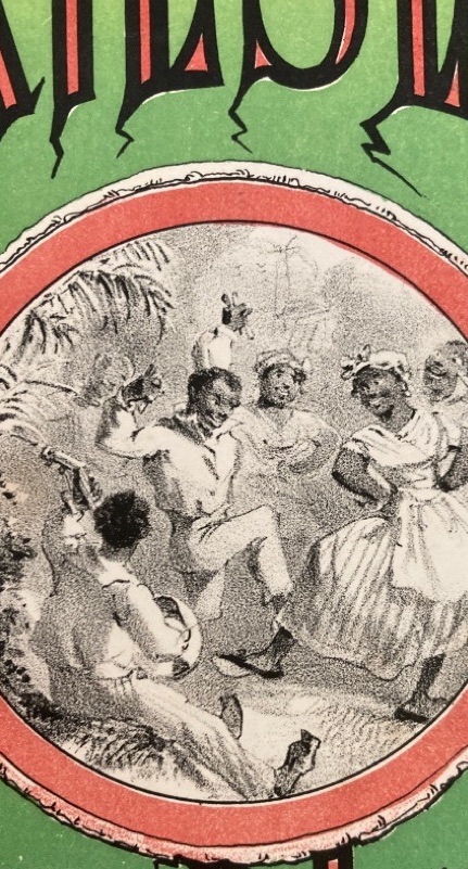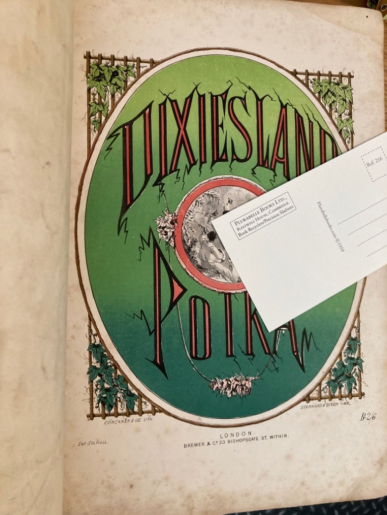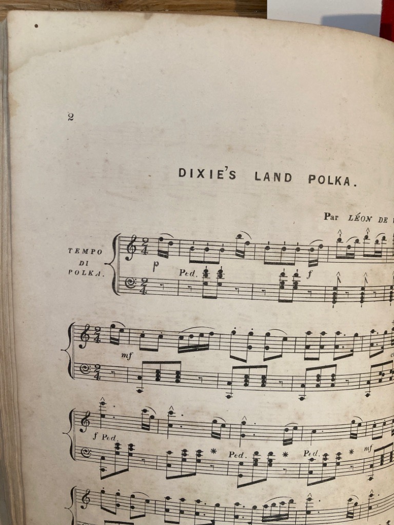 Description: This is a 7 page score with a lithographic colour title page featuring a group of black people dancing. It is bound in a volume of piano scores bearing the name Clara Jane Elgar, in Deal (Kent) 1863 in pencil. This helps with dating the item. The plain cloth binding includes about a dozen different scores, including The Royal Marriage Polka, multiple pieces by J T Stone (With Verdure Clad, Perles Melodieuses 2x), Steven Glover (Grand Parade March, The Merry Polka, The Sweet Briar Polka) Coldstream Band March, The African Quadrille; The Lancer's Quadrilles, etc, Many of the other pieces show marginal water damage, some pages are even torn, but the Dixie's Land Polka is in good condition, being bound towards the middle of the volume. the score does not bear a plate number, Worldcat lists a single copy at Univ of Virginia
