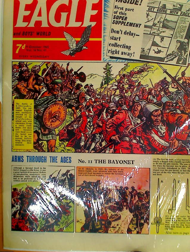 Description: 20p comic strip publication, as issued, single issue, large format (26 cm?), stapled, still bright and fresh, no horizontal crease, well preserved, Dan Dare in The Singing Scourge and Arms Through the Ages No. 11 The Bayonet, supplement pages not included