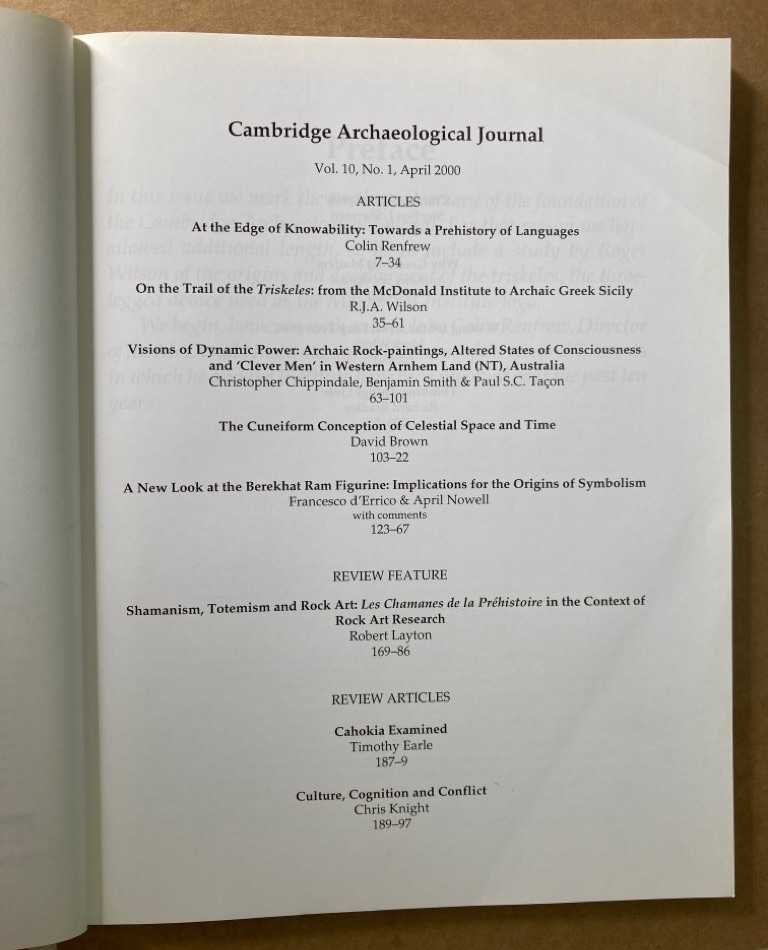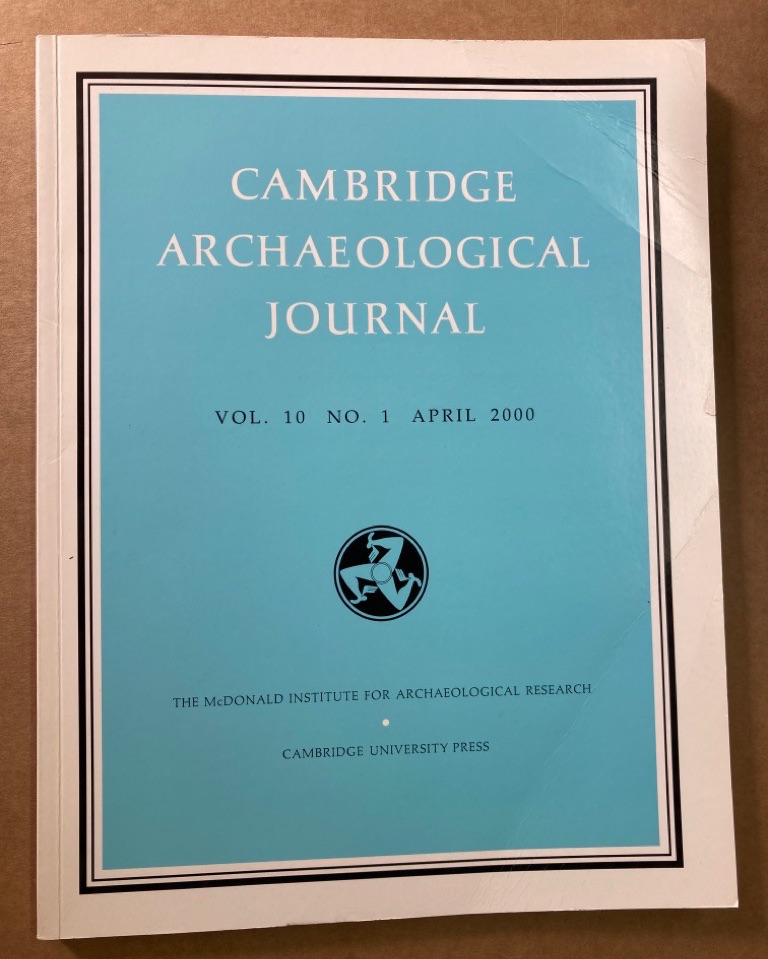 Description: 25p article, Cambridge Archaeological Journal, Volume 10, Number 1, April 2000, also including other interesting articles and reviews, large paperback with blue cover, binding firm, pages clean and neat, diagrams and illustrations, a very good copy