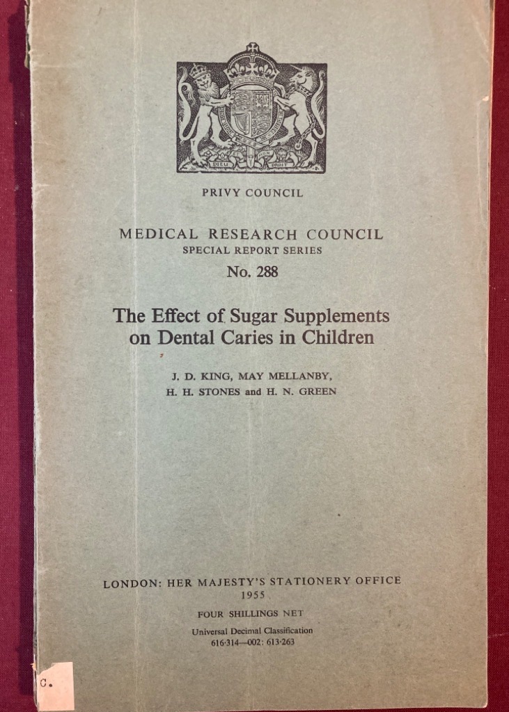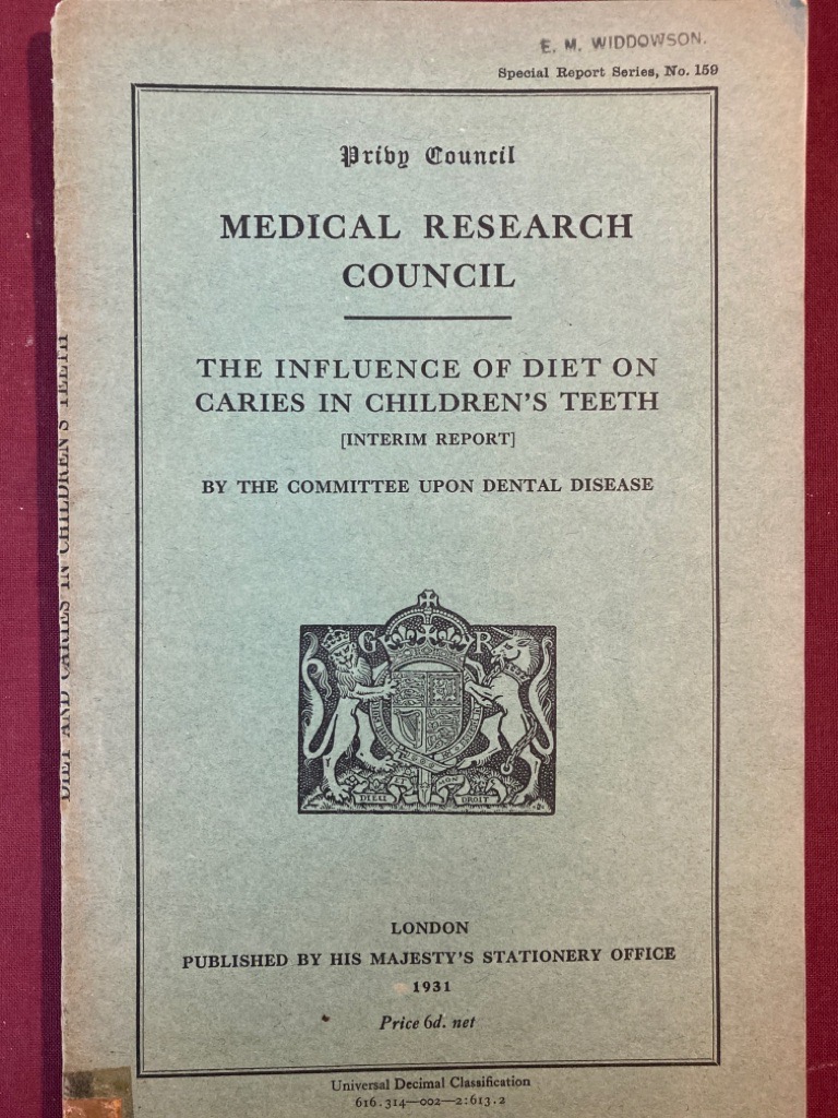 Description: 55p original paper cover intact, no stamps to cover or title, no name, original, small private shelfmark, together with the Interim Report: The Influence of Diet on Caries in Children's Teeth dated 1931, 19p with graphs and tables, name stamp E M Widdowson