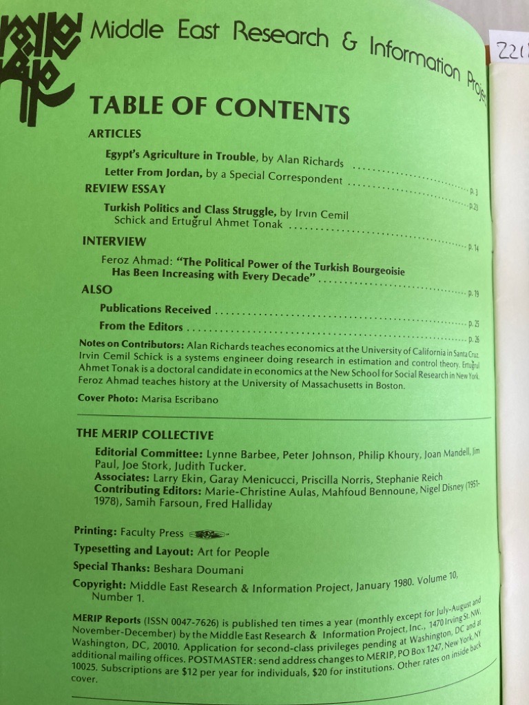 Description: 26p stapled booklet, A4 size, green cover, well preserved, with illustrations, uncommon title, includes also Turkish Politics and Class Struggle (Irvin Cemil Schick), letter from Jordan, Feroz Ahmad on Turkish Bourgeoisie, also current events notes, reviews