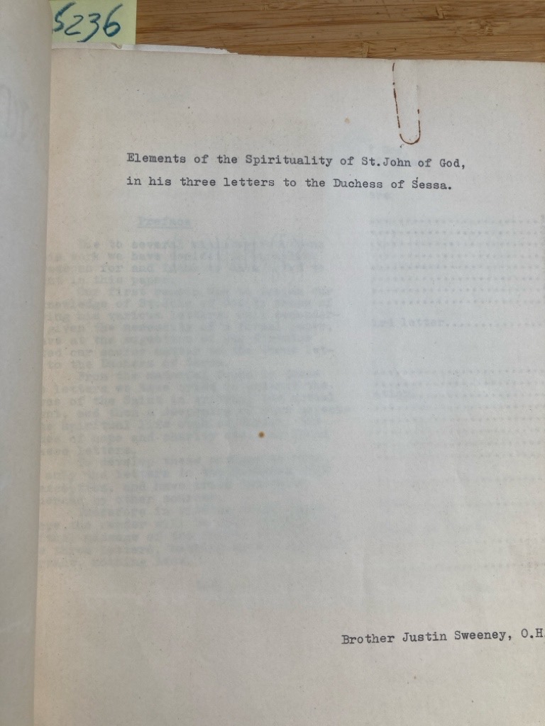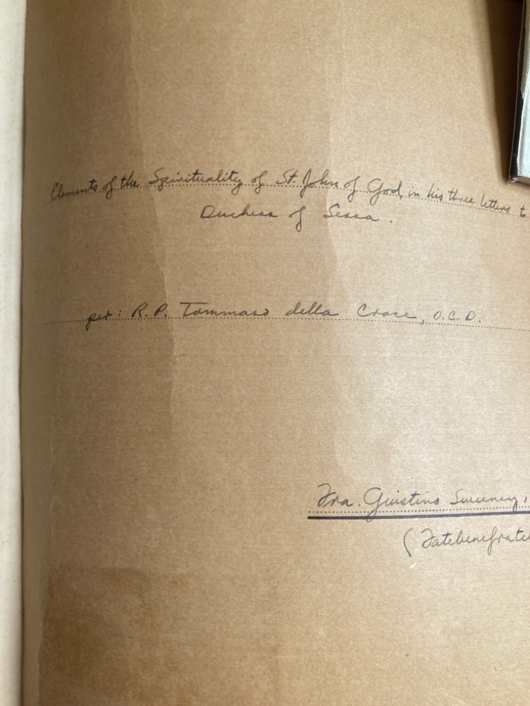 Description: this is a 28p typescript original, bound with ad hoc brown card cover, black cloth spine, MS note inserted "by Justin Sweeney as one of his papers required during his spirituality course in our International College in Rome", inside cover specifies Tommaso della Croce (OCD) as recipient, preface bound in (... due to several misunderstandings...) , unique item