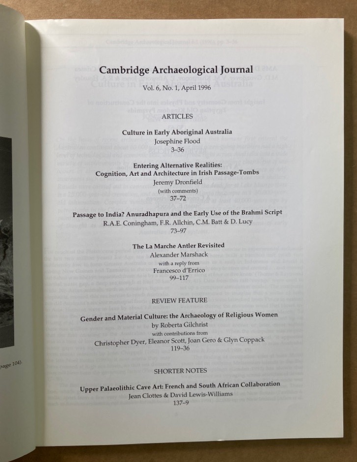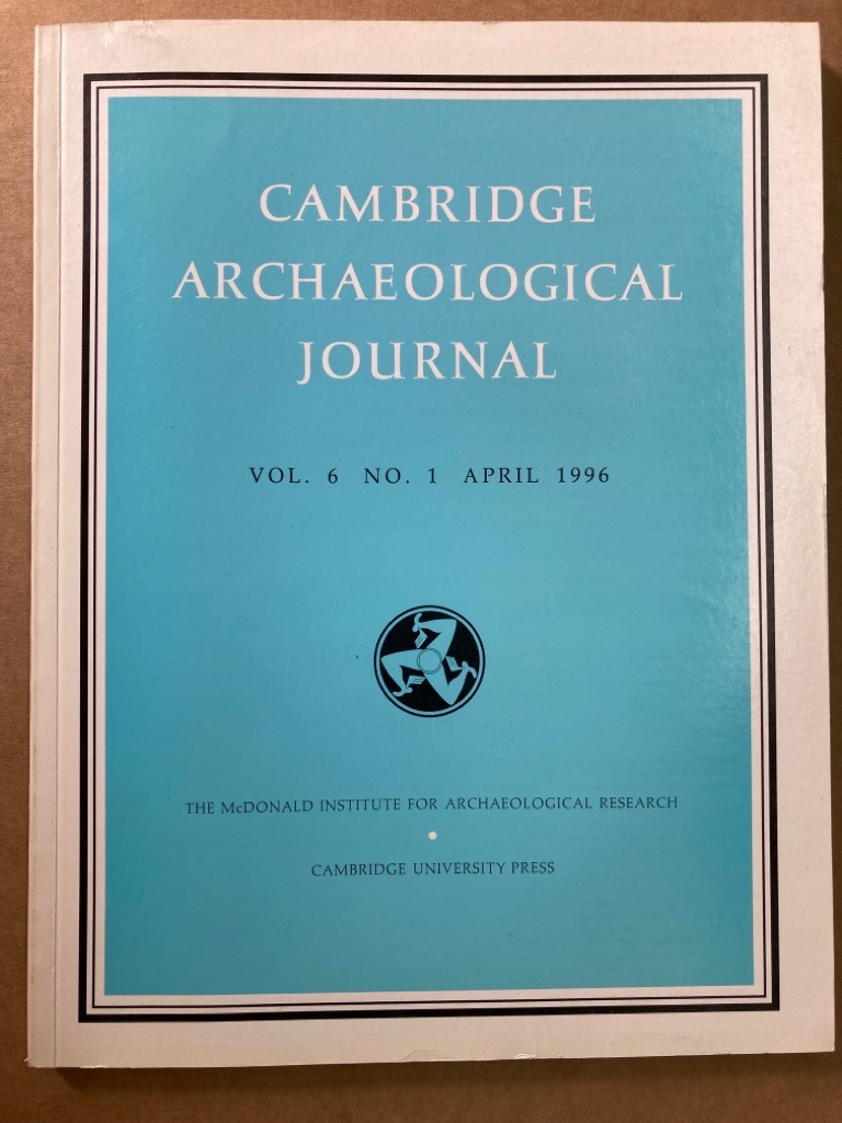 Description: 35p article, Cambridge Archaeological Journal, Volume 6, Number 1, April 1996, also including other interesting articles and reviews, large paperback with blue cover, binding firm, pages clean and neat, diagrams and illustrations, a very good copy
