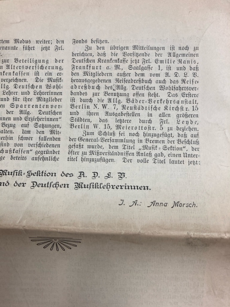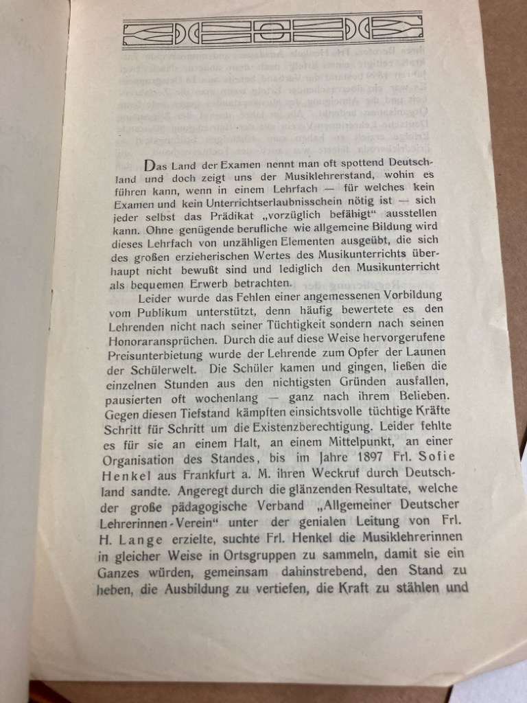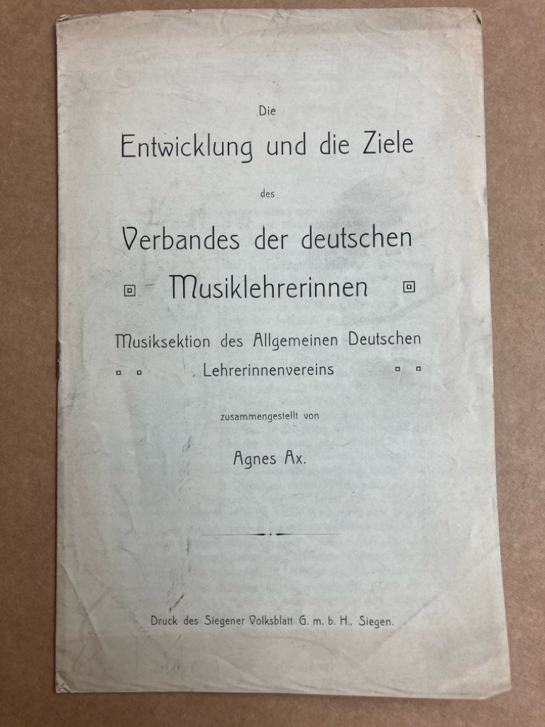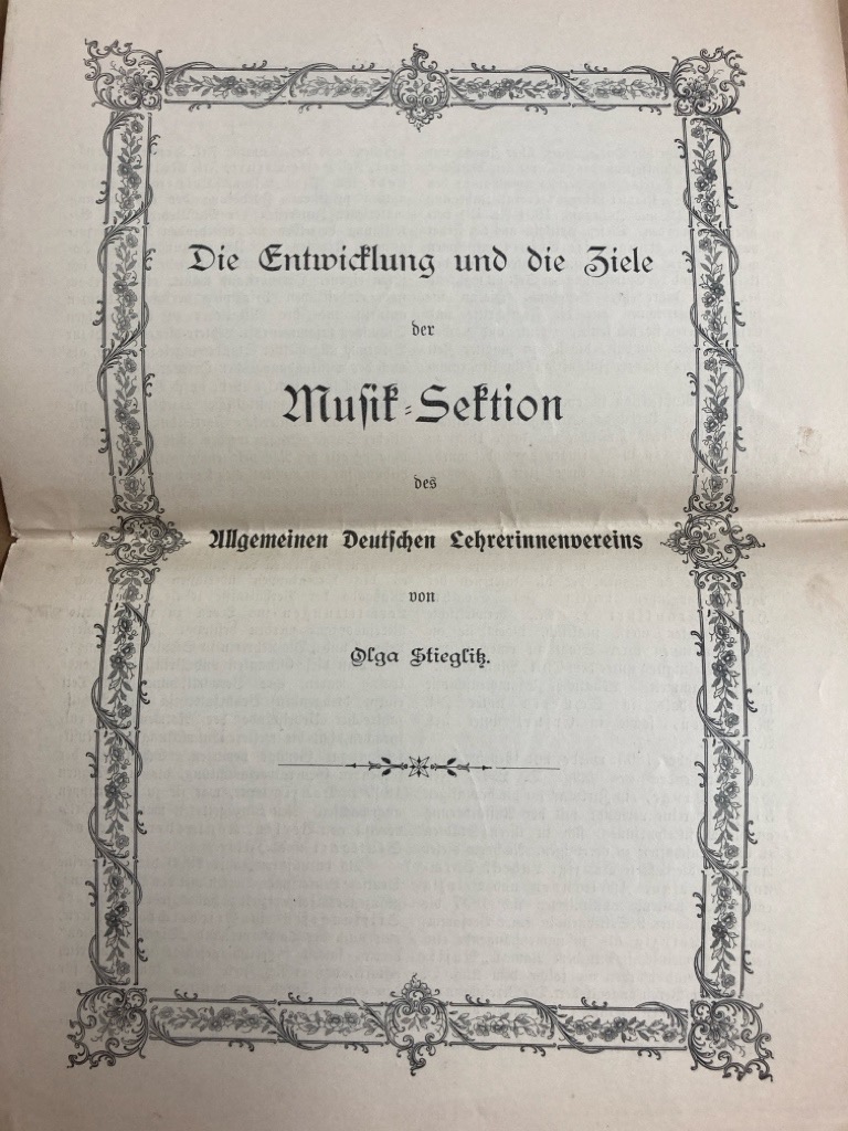 Description: 7p stapled pamphlet, cover a little dusty, reference to the work of Sofie Henkel on the first page, ex libris Sophie Henkel inserted, unique item: Einigkeit macht (*Frauen) stark; together with Olga Stieglitz: Die Entwicklung und die Ziele der Musik-Sektion des Allgemeinen Deutschen Lehrerinnenvereins (1903) with Nachtrag by Anna Morsch, 6 pages, (one sheet folded twice), a little fragile
