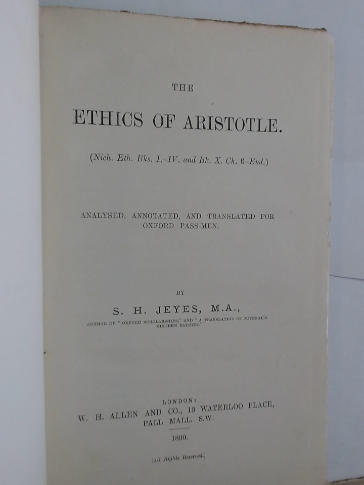Description: vi 233p burgundy hardback, light wear to cloth, gilt title to spine, preface introduces this special and scarce edition as 'written only for the use of Candidates for the Oxford B.A. (pass) Degree. It deals only with those portions of the Nicomachean Ethics which they are expected to translate and understand, and nothing which they are not likely to require has been included in these pages'. Excellent condition, clean and firm.