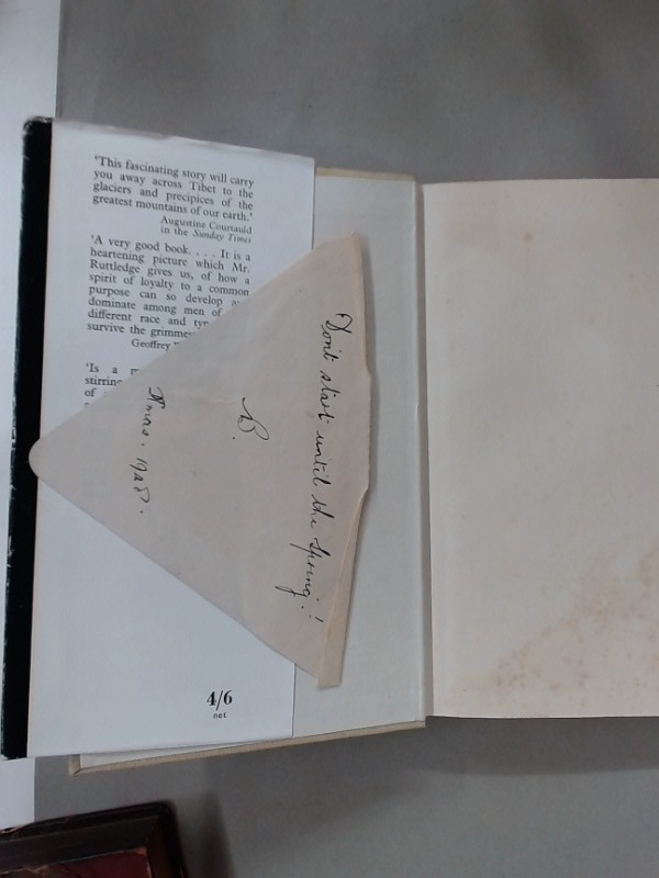 Description: 254p small format black jacket torn, worn incomplete, "Don't start until the spring" note to inside flap, text clean, jacket hurt