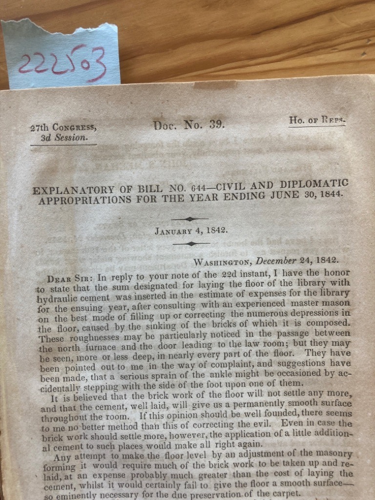 Description: 36p 20p removed from binding, original print, binding solid, a slim item, without cover, this item could easily be inserted in a new binding, = 27th Congress, 3rd Session, House of Representatives, Document 39, a clean copy, contains correspondence from various departments and offices outlining expense and explaining costs. William Barton's ode (p19)for $450 for his Bureau of Surgery and Medicine stands out. includes additional documents dated February 17, 1843
