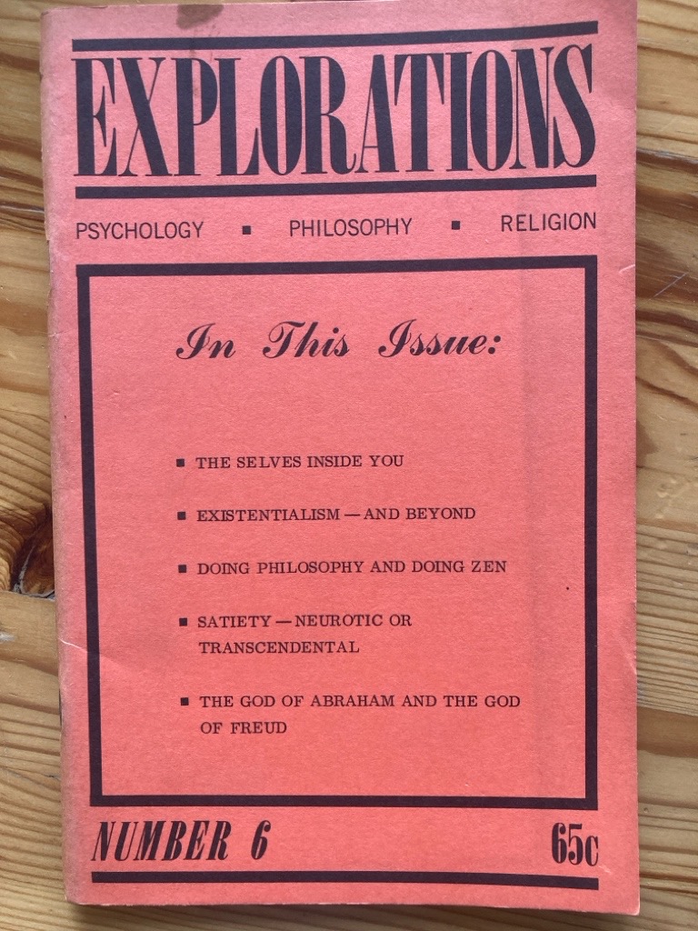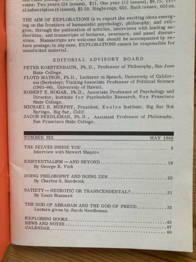 Description: 48p stapled booklet, red cover, very well preserved: The Selves inside you, Existentialism and beyond, Philosophy and Zen, Satiety, The God of Freud, etc
