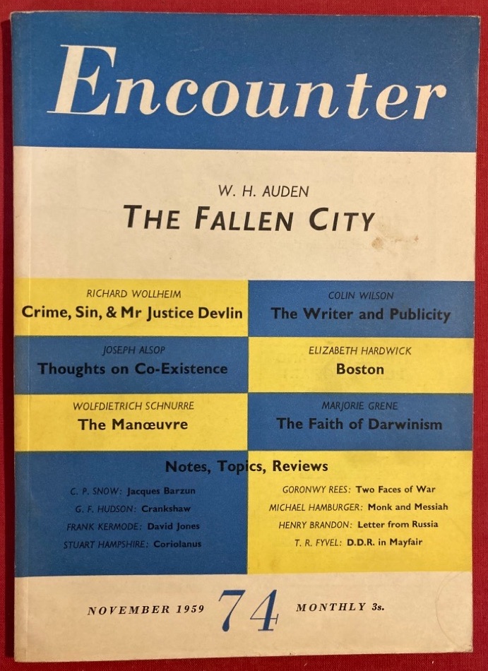 Description: Nice copy, well preserved, first edition of Auden's text, also includes Elizabeth Hardwick: Boston etc, for sale is the whole issue of Encounter.