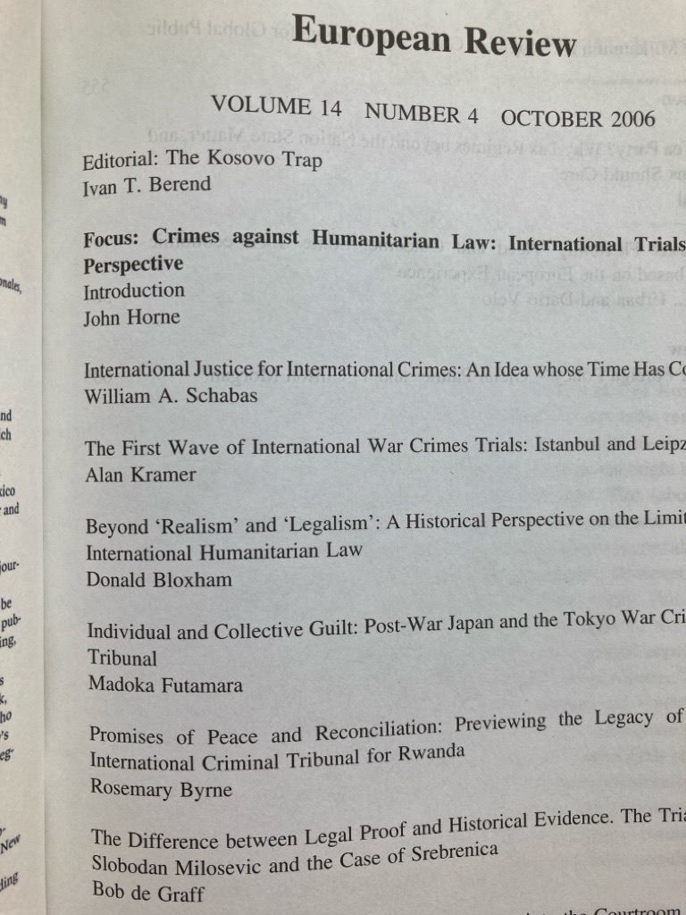 Description: Single issue of this journal, dark cover with map of Europe, well preserved, very good: essays by Schabas, Kramer, Bloxham, Futamara, Byrne, de Graff, Douglas, etc