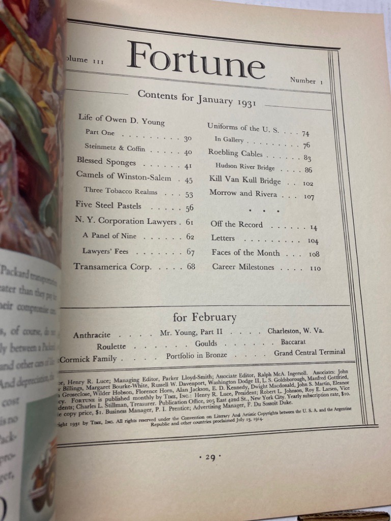 Description: 116p very large oversized paperback, colour cover, many period adverts, including Empire State Building, car adverts, essays on Blessed Sponges (Diving), Camels of Winston Salem (Tobacco), Roebling Cables, industrial artwork by Roderick Mackenzie, striking colour illustrations, very well preserved but small hurt to spine