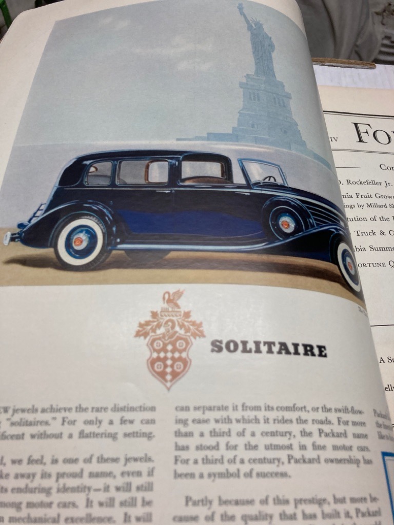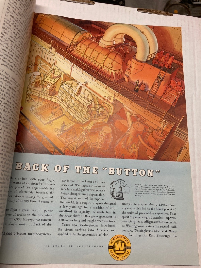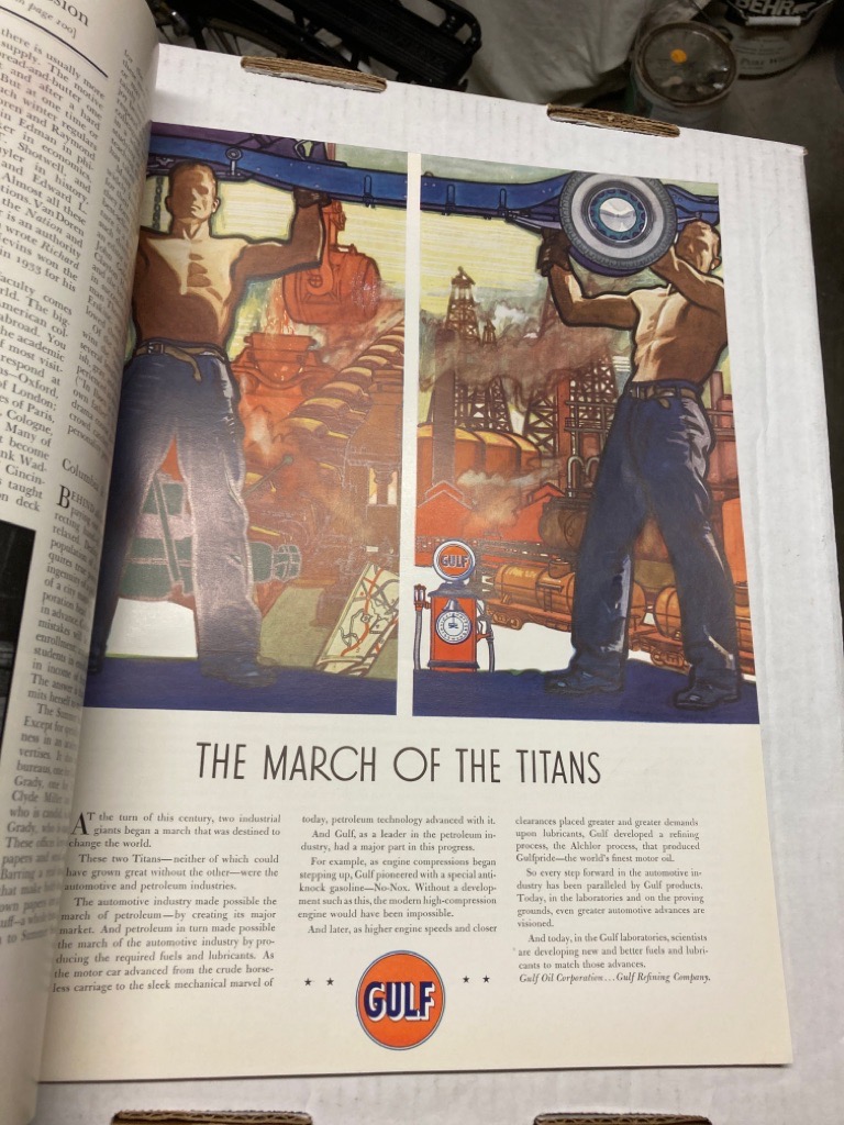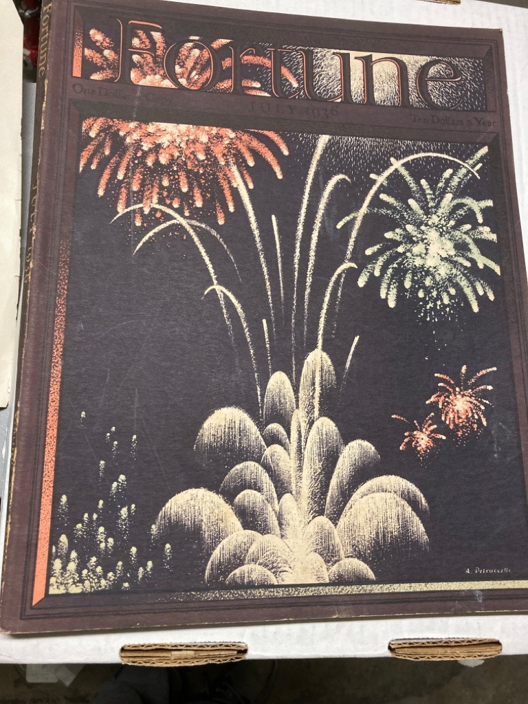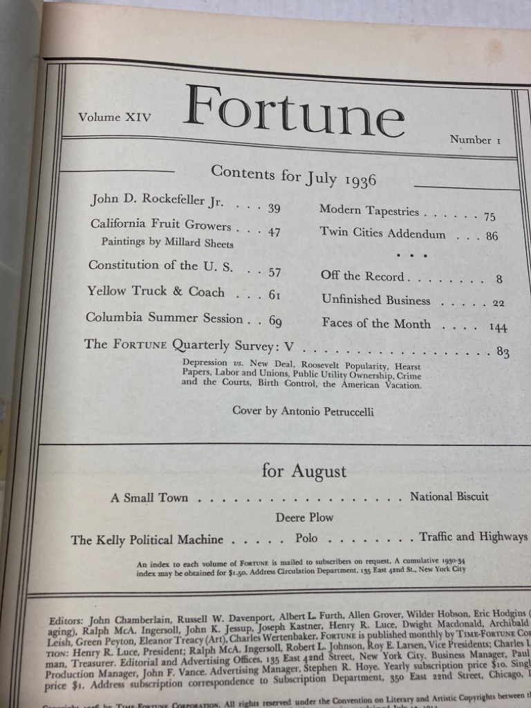 Description: 116p very large oversized paperback, colour cover, many period adverts, including car adverts, essays on John D Rockefeller, California Fruit Growers, Yellow Truck & Co, Modern Tapestries, striking colour illustrations, very well preserved, cover by Antonio Petruccelli