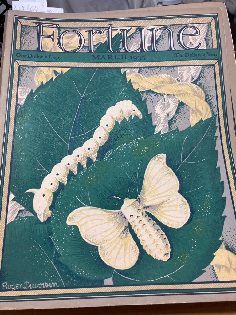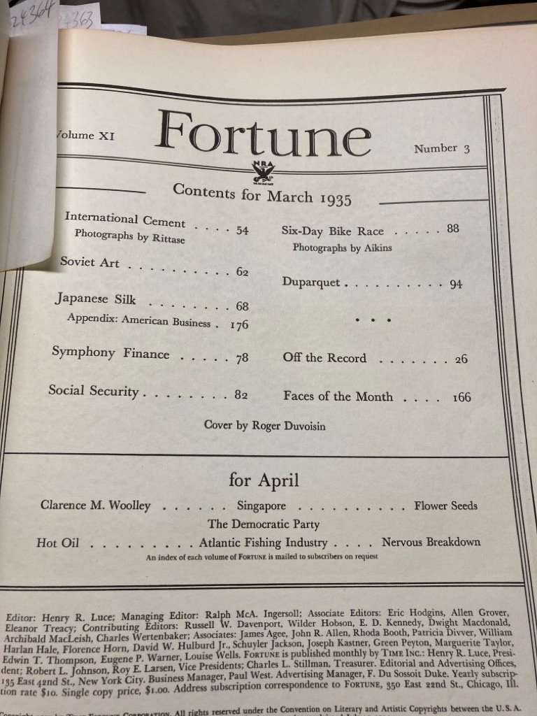 Description: 164p very large oversized paperback, bright green colour cover, many period adverts, including car adverts, essays on International Cement, Soviet Art, Japanese Silk, Social Security, Six-Day Bike Race, Duparquet, striking colour illustrations, very well preserved, cover by Roger Duvoisin