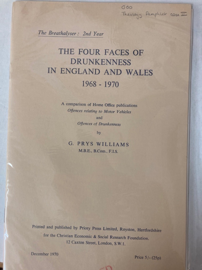Description: 8p stapled booklet, with tables, well preserved, faint library stamp: The Breathalyser: 2nd Year, together with "Chief Constables' Anxieties and Preoccupations 1966", 15p pamphlet
