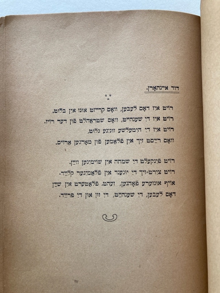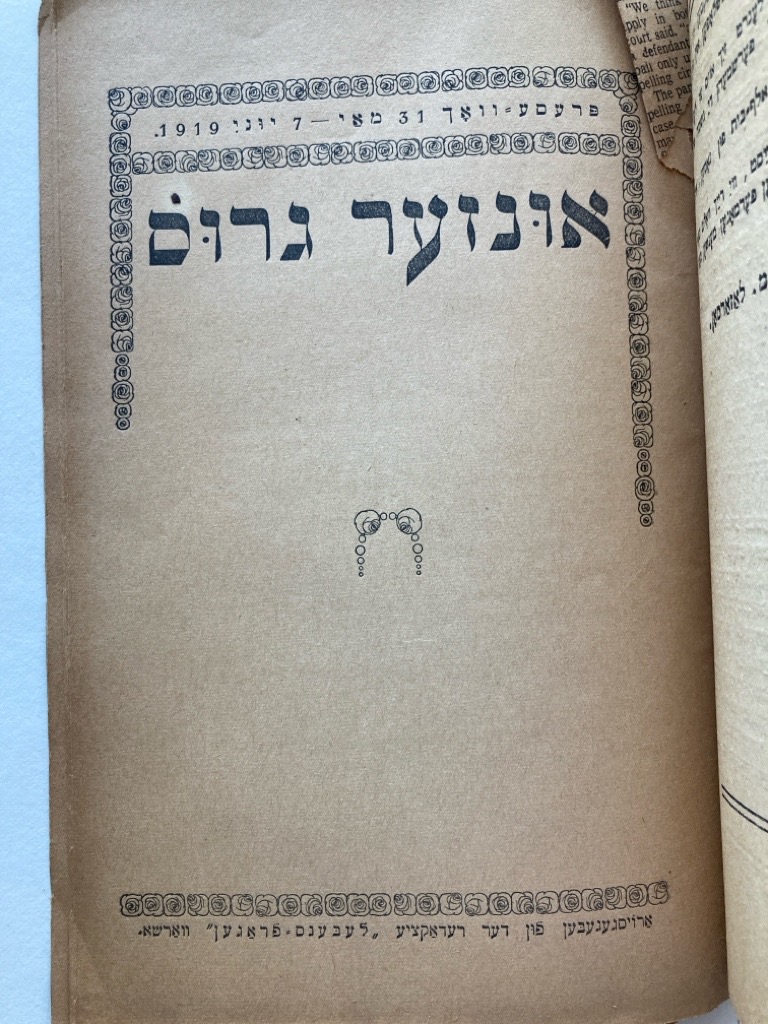Description: 56p front cover missing, title detached, paper fragile and brittle, author also written "Stavi", in the back bound 24p, "Our Greetings" from the editors of Lebens Fragen, dated 7 June 1919 (contributions by Medem, David Einhorn, Schulman, etc)