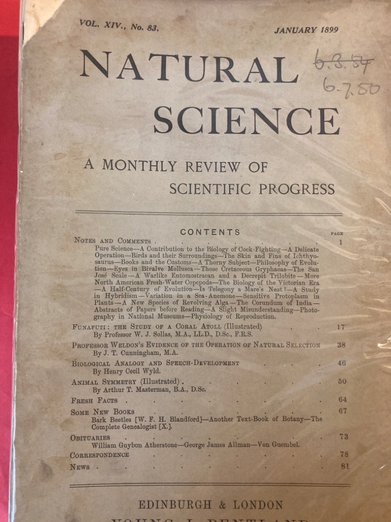 Description: 20p essay in "Natural Science", with illustrations, contains also Notes, Fresh Facts, Cunningham on Weldon's Evidence of the Operation of Natural Selection, Mastermann on Animal Symmetry, etc, the entire issue 92p, grey paper cover, spine a little fragile, first edition, very good