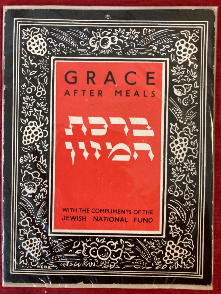 Description: 8p stapled booklet with black/red card cover, main text in Hebrew with correction to heading of last page, back cover has sample bookplate which advertises the option to order multiple copies with "presented to you by the courtesy of . . ." feature, well preserved, scarce item, proceeds of this sale to benefit Palestinian charity