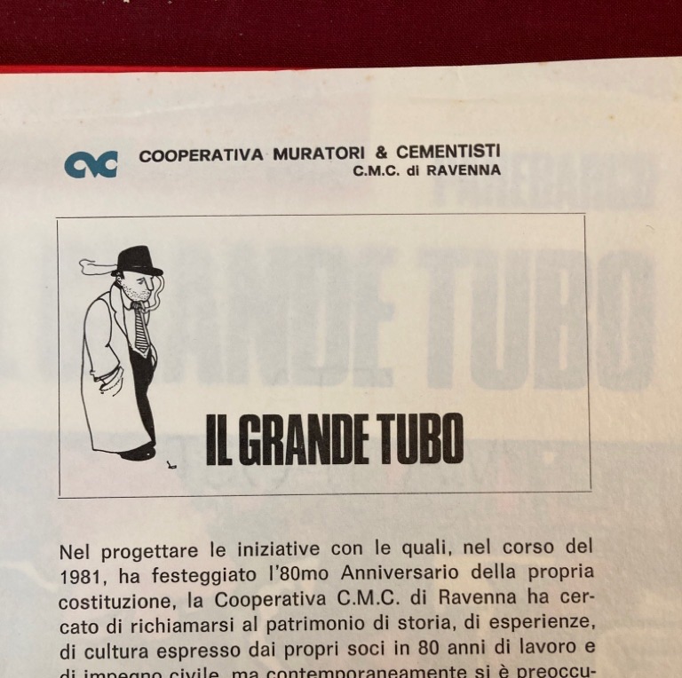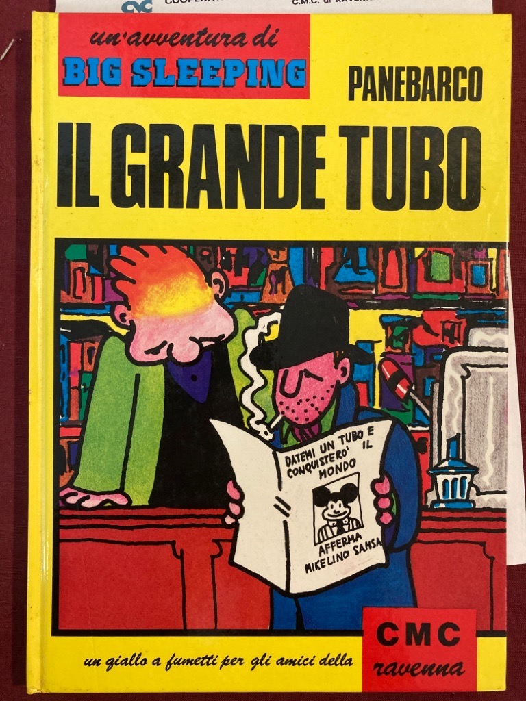 Description: yellow hardback, laminated boards, approx 86p of cartoons, "un giallo fumetti per gli amici della CMC Ravenna," this edition produced for Cooperativa Muratori & Cementisti di Ravenna for its 80th anniversary, inserted sheet explains the background of this edition, CMC ink stamp to endpaper
