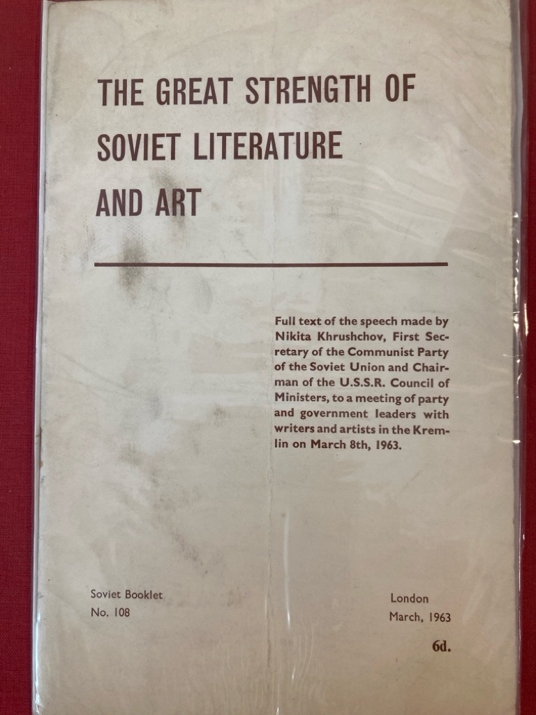 Description: 38p pamphlet, "Full text of the speech made by Nikita Khrushchov, First Secretary of the Communist Party of the Soviet Union and Chairman of the USSR Council of Ministers, to a meeting of party and government leaders with writers and artists in the Kremlin on March 8th, 1963." crease to front cover, otherwise clean unmarked pages, very good
